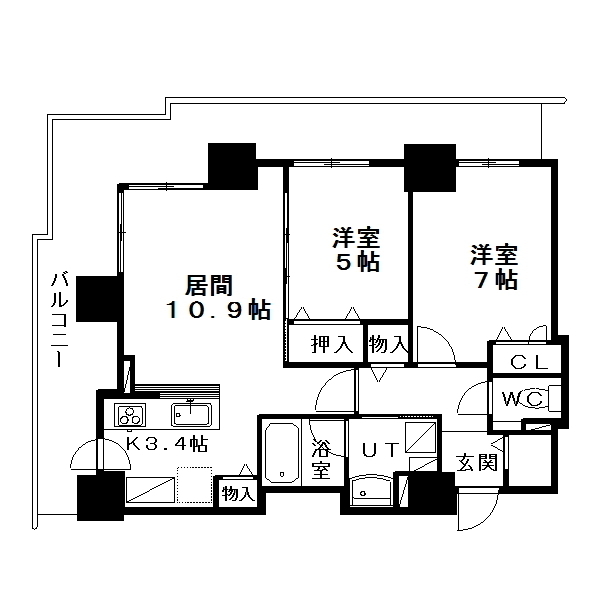2LDK(LD10.9帖、K3.4帖、洋7帖、洋5帖)