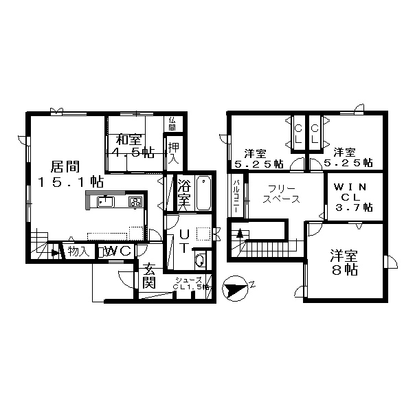 4SLDK(LDK15.1帖、和4.5帖、洋5.25帖、洋5.25帖、洋8帖+フリースペース)