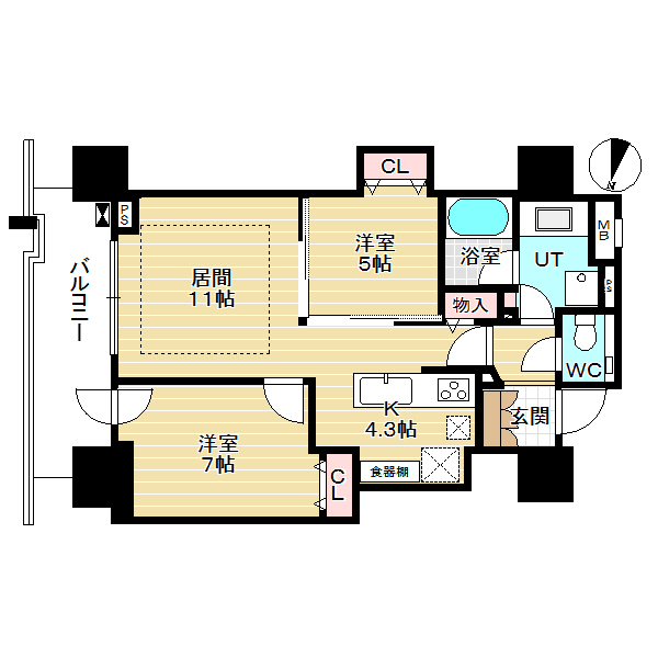 2LDK(LD11帖、K4.3帖、洋7帖、洋5帖)